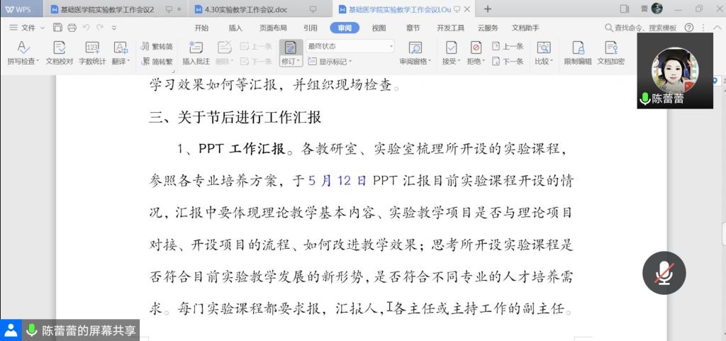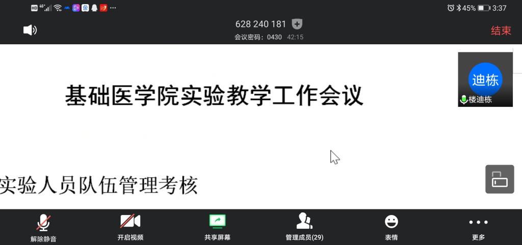 4月30日下午,72886必赢欢迎光临利用线上腾讯会议室召开实验教学工作会议。院长楼迪栋、副院长陈蕾蕾,教研室、实验室主任、副主任及科教科老师参加会议。